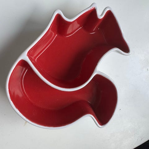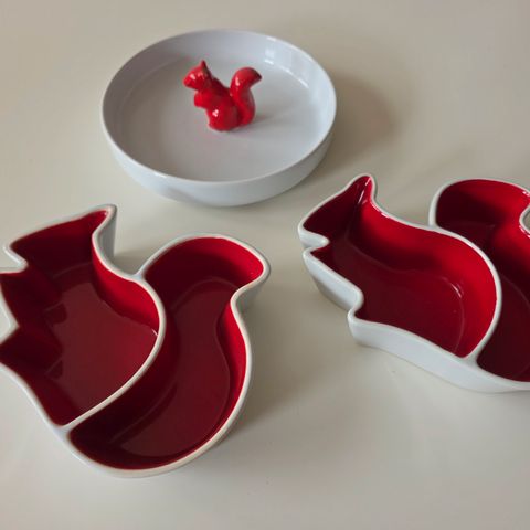 Sagaformin tekemä valkoinen vati taikka kulho, jossa keskellä punainen orava. Halkaisija 18 cm, korkeus oravasta n. 7 cm.