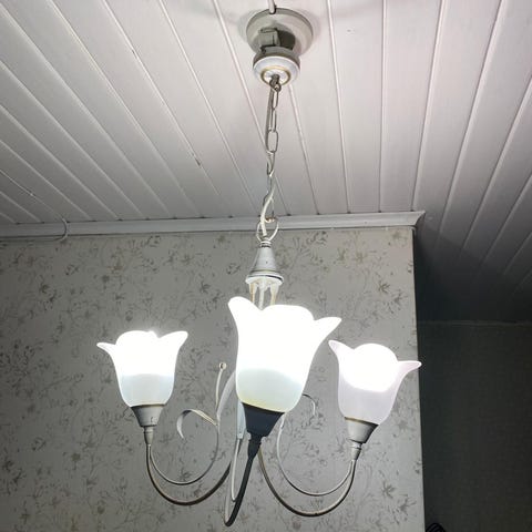 Vintage kattokruunu viidellä lasikuvulla. Valaisin on täysin ehjä ja toimiva. Materiaali rungossa puuta ja metallia. Lasikuvun ulkohalkaisija noin 19 cm. Valaisimen korkeus 40 cm + ripustin 30 cm. Valaisimen ulkohalkaisija 80 cm.