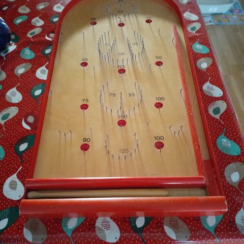 Vintage lasten puinen fortuna 50-luvulta jossa on värikkäät sirkus aiheiset piirrokset ja metallinen toimiva jousella oleva kuulan syöttö. Koko on noin 21 cm leveä ja 41cm pitkä Peli on tarkoitettu sisäkäyttöön ja soveltuu lasten viihteeksi.kuulan saa mukaan, mutta se on peliin liian iso. Toimii silläkin.