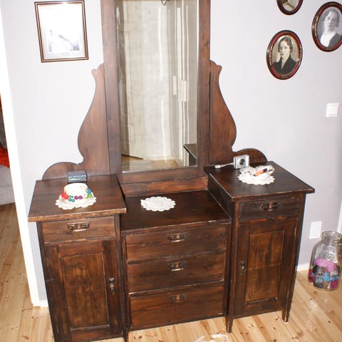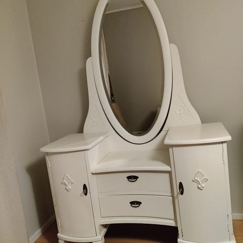 Vanha n. 100 v. Peilillinen piironginlaatikosta yläosa. Toisesta laatikosta puuttuu pala, muutoin yksityiskohdat ok. Nouto Laitilasta.