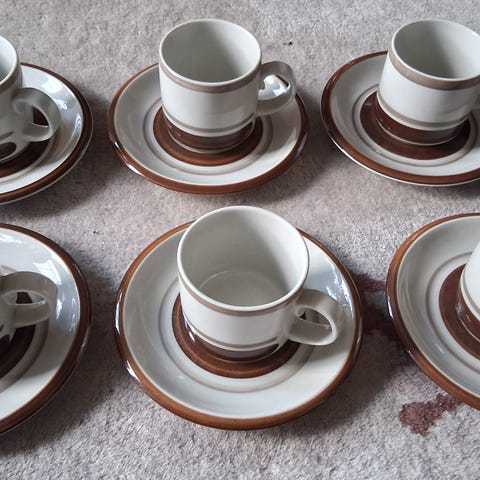 Arabia Pirtti sarjan 6 kahvikuppia tasseineen ja 7 kpl pullalautasia. Hyvä käytetty kunto.
