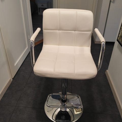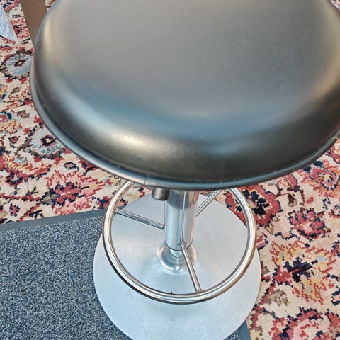 Baarijakkara, jossa musta pehmustettu istuin ja musta metallirunko. Jakkarassa on jalan tuki ja se on suunniteltu baarikäyttöön tai korkealle pöydälle. Istuinkorkeus 70 cm istuimen takakaari 78 cm