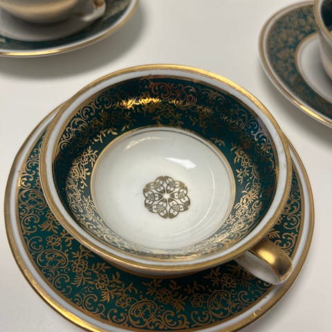 Kuusi kuppia, kuusi teelautasta ja kuusi lautasta, kaikki ehjiä, käyttämättömiä.