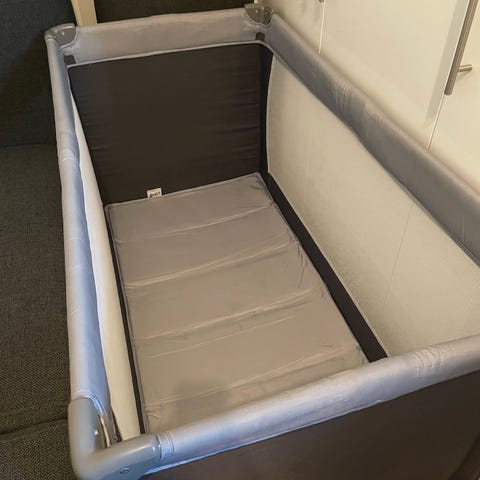 Meillä ollut käytössä aika vähän kun vauva nukkunut aina vieressä. Voi yhdistää omaan sänkyyn. Toinen puoli saa auki vetoketjuilla. Korkeutta voi säätää. Oma pussi tulee mukaan. Keskustasta haku