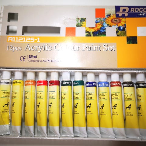 Erilaisia akryyliväripurkkeja ja -putkia, noin 50 ml kokoisia, eri valmistajilta. Sisältää useita värejä. Soveltuu maalaamiseen ja taiteelliseen käyttöön. On omassa käytössä ollut eli ei kaikki ole uusia, hintaa saa tinkiä!