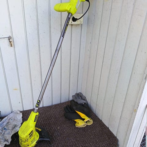Sähkökäyttöinen trimmeri (siimaleikkuri). Toimii