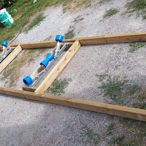 Myydän kuvan mukaisen katamaraanin ponttoonien runkomuotti (2 puolikasta). Muotti lasikuitua. Pituus 12 m, leveys 1,6m.