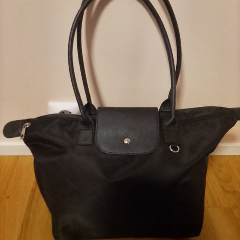 Myydään mustaharmaasta paksusta sisustuskankaasta tehty pussukkalaukku jossa paksu säädettävä puuvillahihna, max.pituus 165 cm. Laukussa erillinen vuori ja välissä silitetty tukikangas. Laukun leveys yläosasta 21 c, korkeus 22 cm.