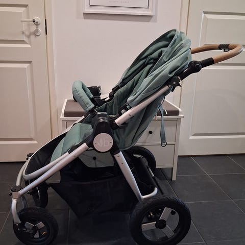 Bumbleride lastenrattaat turkoosilla kankaalla. Rattaissa on turvavyöt, muovista sadesuojaa en löytänyt. Tyylikkäät ja hyvin säilyneet.