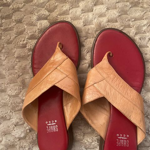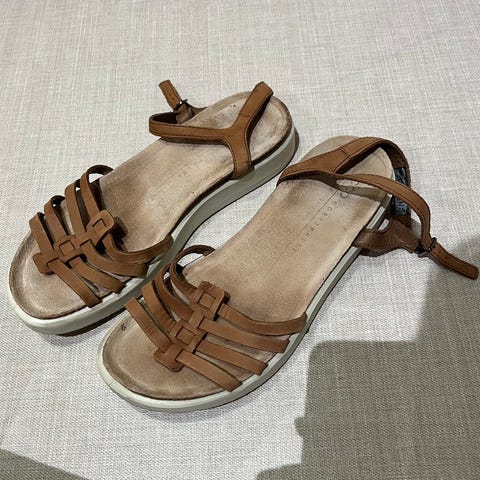 Beigenväriset naisten nahkasandaalit. Sandaalit ovat siistit ja ehyet.