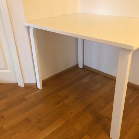 Kulumaa, kolhuja ja pieni maalitahra pöytälevyn sivussa. Pöytä heiluu hieman.