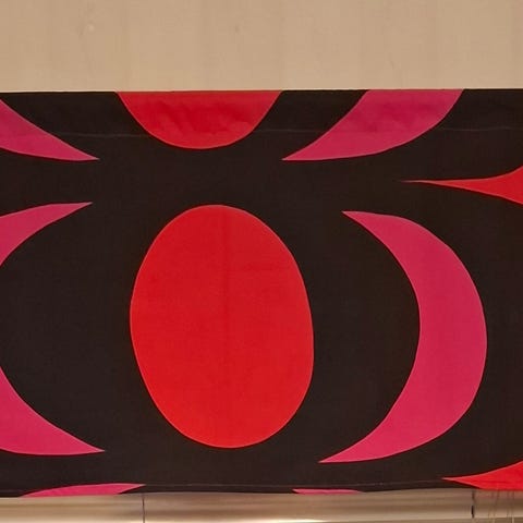 Marimekko, näyttävä ja tyylikäs Ananas -kankaasta oleva verhokappa. Kapan voi pujottaa tankoon tai ripustaa nipsuilla joko suorana tai vähän rypytettynä. Verhossa on kaunis pinta.