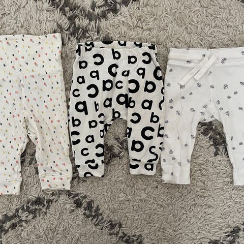 Vauvan housupaketti, koko 56. Erilaisia housuja, mukaan lukien raidalliset, yksiväriset ja röyhelöillä varustetut mallit. Yht 6kpl.