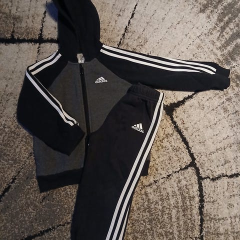 Adidas lasten collegeasu, koko 92. Asu koostuu harmaasta vetoketjullisesta hupparista, jossa siniset yksityiskohdat ja mustista housuista.