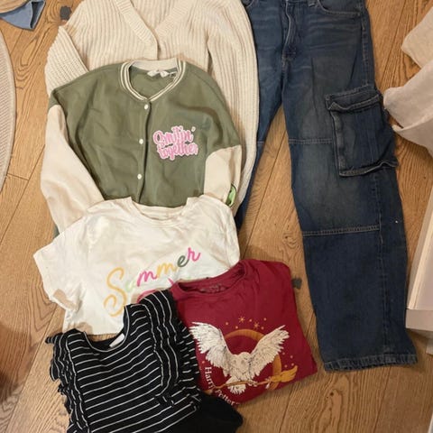 Tytölle pakettina kahdet housut, molemmat kokoa 164 cm. Vaaleansiniset farkut MNG Kids sekä vihertävänharmaat Zara-merkkiset kangashousut. Molemmissa housuissa on sivu- ja takataskut sekä vyötärön säätömahdollisuus kuminauhojen ja nappien avulla.