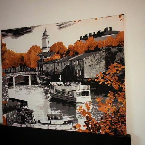 Vallilan Espa -kankaasta Vallilan liikkeessä tehty & sieltä ostettu taulu. Kehys puurimaa, kangas pingotettu ja kehykseen nidottu. Kunto hyvä, muuton jälkeen meille tarpeeton. Hp. 50e. Nouto Vantaan Varistosta.