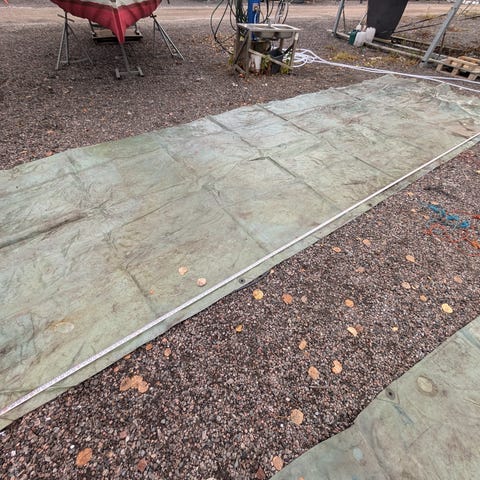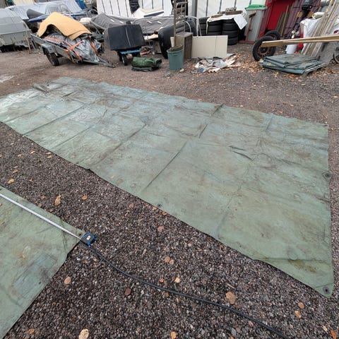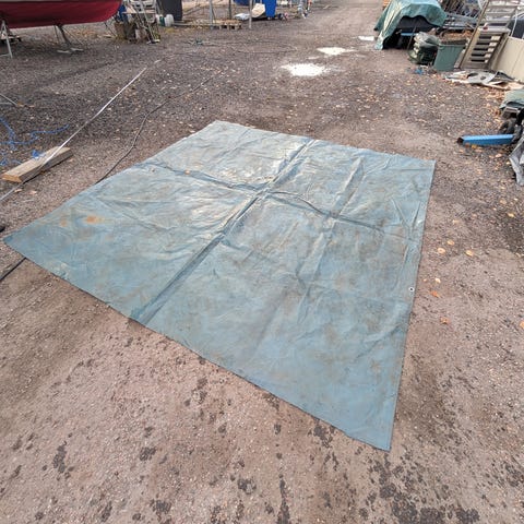 Ehjä kestävä raskaspeite / pressu. Purjerenkaat kolmella sivulla. Muutamia paikkauksia. Tämä ei lähde tuulen mukana tai hajoa kovin helpolla