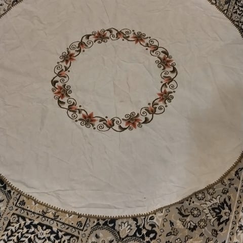 Kaunis mintunvihreä jackard-kuvioinen pyöreä pöytäliina. Ruusu kuvio.