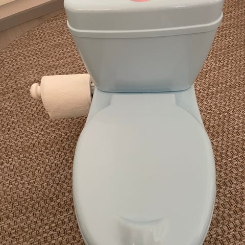 Pieni seepra potta. Hieman pölyinen mutta muuten siisti. Todella hyvä ensi pottailuun kun on matala istumakorkeus.
