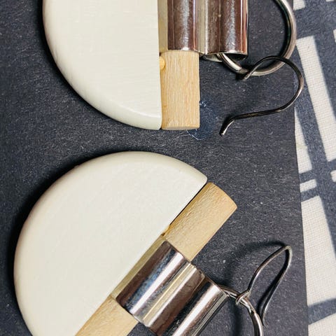 Aarikka taateli puna-mustat korvakorut, puuta, paristi käytetty.