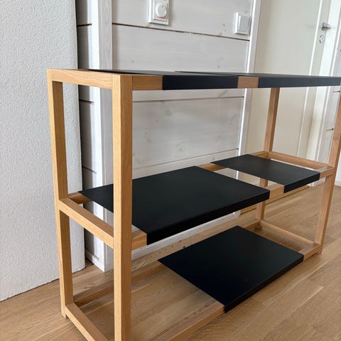 Uudenveroinen musta Swedese Libri hylly. Ostettu Vepsäläiseltä, hinta uutena 570 e.
