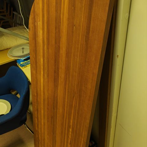 Pöydät materiaali on luultavasti akaasia mutta ei 100% varmuutta. Yhdessä kuvassa yksi halkaistu pöytä missä näkee sisäpuolen.