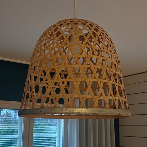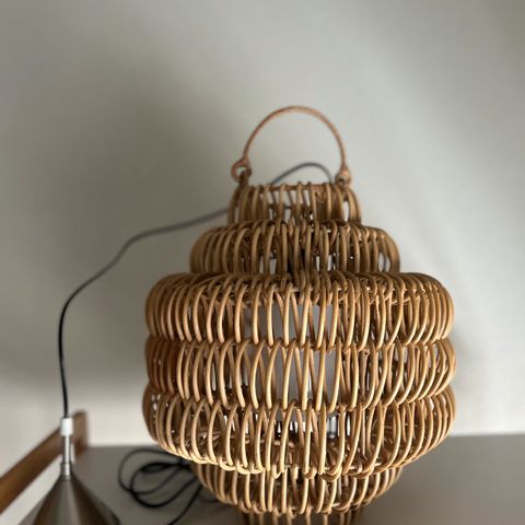Rottinkikattolamppu, 3 lamppua, leveys 56 cm, varjostimen korkeus 35 cm, noin 1 m johtoa/kettinkiä katosta. Sijainti Kaartinkaupunki.