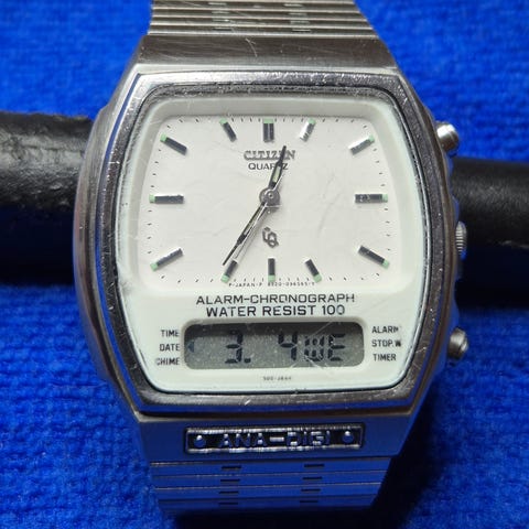70 - luvun Japanin sisämarkkinoille suunnattu malli (JDM),(tämä yksilö -73) CITIZEN Cosmotron sarjan edustaja metallihohto purppuran värisellä taululla hivenen harvinaisemmasta päästä.