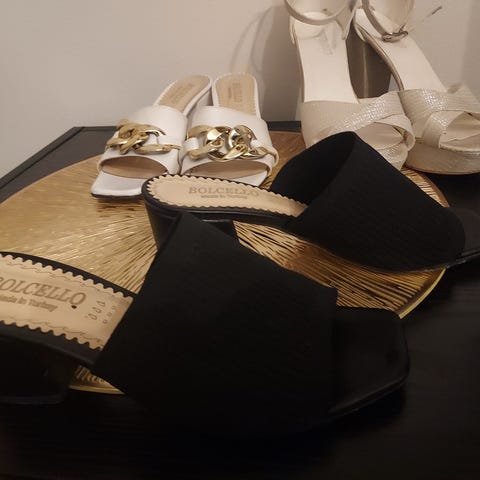 Valkoiset, kultasolkiset juhlavat sandaalit. Koko 38