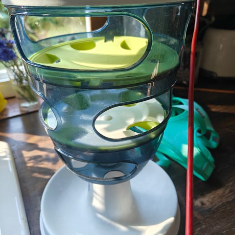 Useatasoinen kissojen nappulalabyrintti. Ehkäisee kissan ahmimista. Kaipaa hieman putsausta säilytyksen jälkeen.