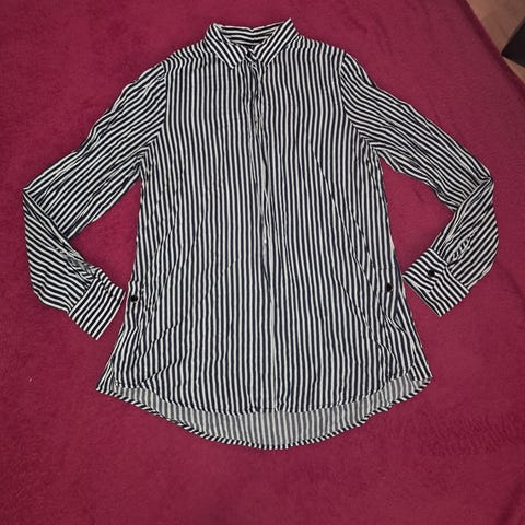 Sini-valko raidallinen Amisun kauluspaita. Hyväkuntoinen, joitakin pieniä yksittäisiä langanpätkiä saattaa löytyä, muuten käyttöikäänsä nähden erinomaisessa kunnossa. Koko XS.