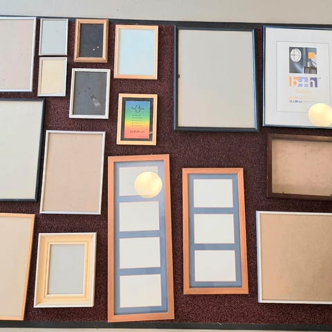 Mustia, kiiltäväreunaisia kehyksiä kolmessa eri koossa: 2 kpl 30x40cm, 4 kpl 21x29,7cm (kaksi puutttuu kuvista) ja 4 kpl 10x15cm (yksi avaamaton puuttuu kuvasta). Kaikissa koissa yhdet kokonaan avaamattomat kehykset paketissa. Pienimmissä kehyksissä yksi ottanut vähän osumaa, ks. kuva. Osassa kehyksistä 3M-tarrat takana, joilla olleet seinässä, mutta nämä saa halutessaan helposti irti. Kaksi pienempää kokoa mahdollista laittaa myös seisomaan pöydälle.