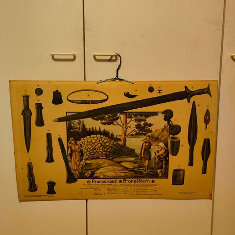 Vanha opetustaulu, aiheena pronssikausi. Taulu nr. 2 Valistuksen historiallinen kuvasto -sarjassa. Kunto tyydyttävä.