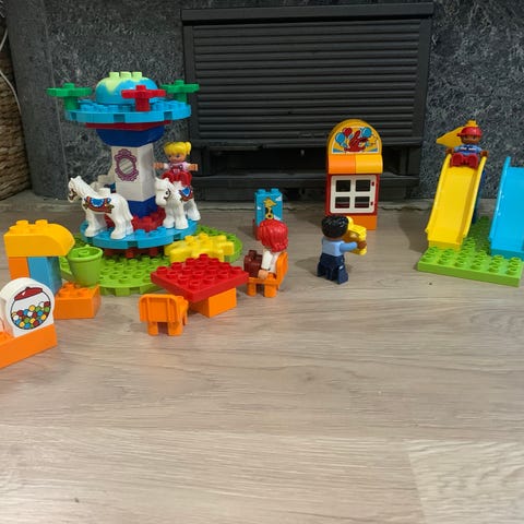 Vanhoja duploja vuosien takaa. 117 palaa ja lähinnä leikkipuisto/huvipuisto teemaa. Kolme ukkoa ja pari eläintä sekä muutamia ajoneuvona mukana. Ehdoton kohokohta ja lasten suosikki tuo putkiliukumäki.