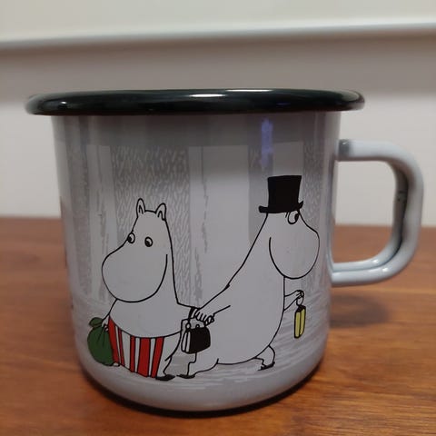 Muurla Muumi emalimuki, tilavuus noin 3,5 desilitraa, ruskea väri, materiaali emali. Muki on suunniteltu arkikäyttöön ja soveltuu esimerkiksi juomien tarjoiluun.