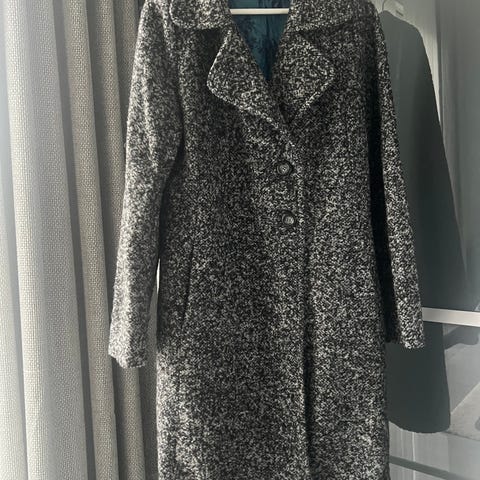 Sisleyn klassisen tyylikäs villakangastakki, kokoa 40, kirjava väritys, missä violettia, vaaleaa beigeä ja mustaa. Takissa on koristeelliset yksityiskohdat hihoissa ja etuosassa. Vuorellinen malli. Siisti, ei nukkaantunut.