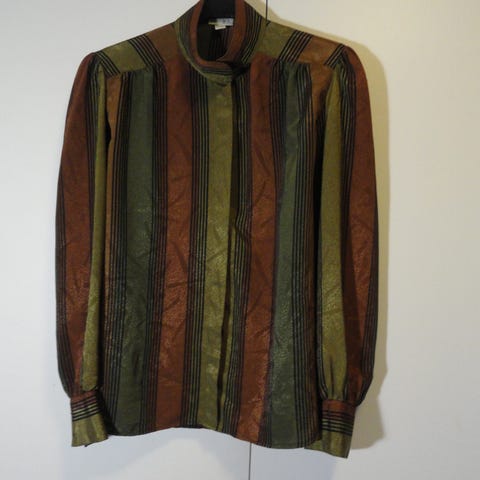 ** Ruskeasävyinen Amanda juhlajakku/-paita, mater. 40% viskoosi, 30 % puuvilla, 30% dioleeni. Helmassa kuminauha, koko 42, oikein hyväkuntoinen.