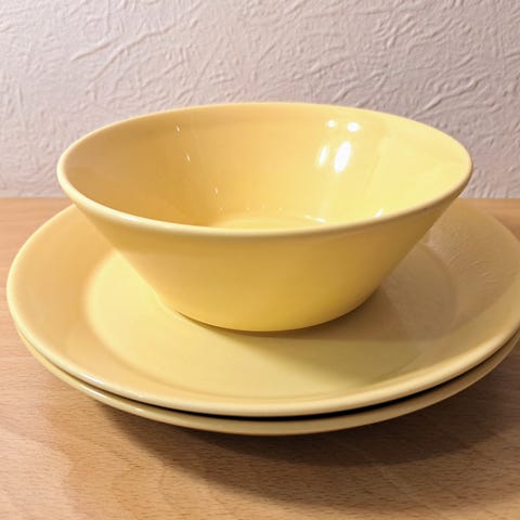 Arabia Teema/Kilta? lautasset, väriltään keltainen. Ehjiä mutta käytössä olleita, käytön jälkiä nähtävissä.