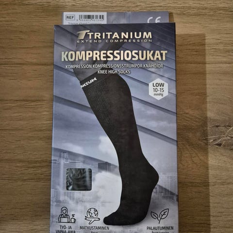 Kerran pestyt Tritanium korkean paineluokan kompressiosukat koko S3.