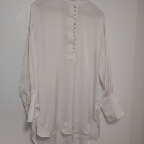 Myydään naisten silkkinen hihaton paitapusero. Leveää ja löysää mallia. Kauluksessa koristenauha. Ei superpitkä, muttei nyt napapaitakaan.