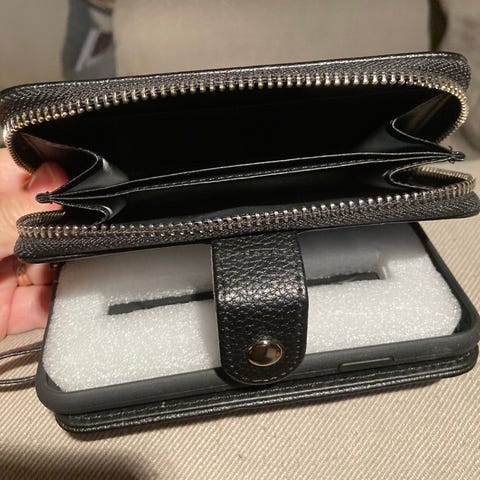 Lompakko jossa paikkoja korteille ja puhelimelle