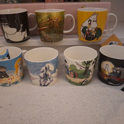 Arabia Muumimukit, yhteensä 12 kappaletta. Mukit ovat eri värejä ja niissä on erilaisia Muumi-hahmoja ja -kuvituksia.