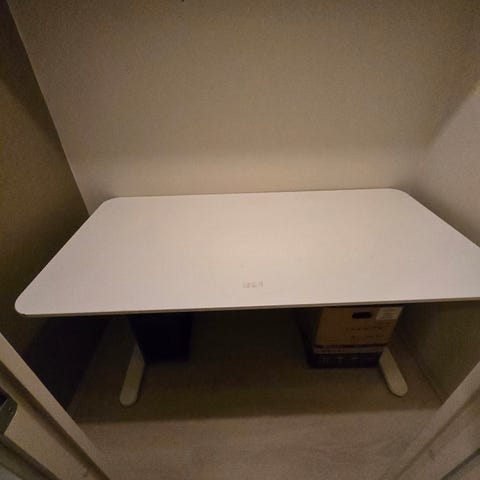 Hyväkuntoinen, toki pieniä käytön jälkiä, jotka näkyy vain lähimmällä tarkastelulla. Yleisilme siisti. Säädettävät jalat, kuvassa ollessa korkeus 75cm, mutta on varaa suuntaan ja toiseen. Alla johdoille verkko. Pöydän kulma oikealla.