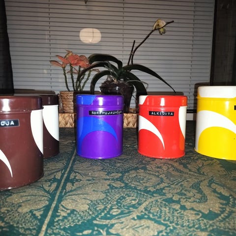 Kaikki ikäänsä nähden siistikuntoisia. Lisäksi yksi iso raidallinen kanneton kahvipurkki.