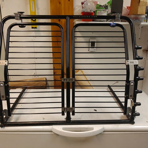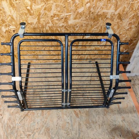 Myydään Kulkukoira-merkkinen veräjä. Mitat:korkeus 90 cm, leveys (ilman tappeja)88cm, putkien syvyys 60cm. Kaltevuus säädettävissä. Soveltuu useampaan autoon säädettävyyden vuoksi. (Dogateasy) Yhdet avaimet mukaan sekä ylimääräisiä sivutappeja