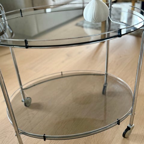 Alemman hyllyn kulmissa vaurioita ja ruuvien reiät ovat hieman huonot, mikä takia normaaleilla ruuveilla tarjoiluvaunu voi olla hieman epävakaa.