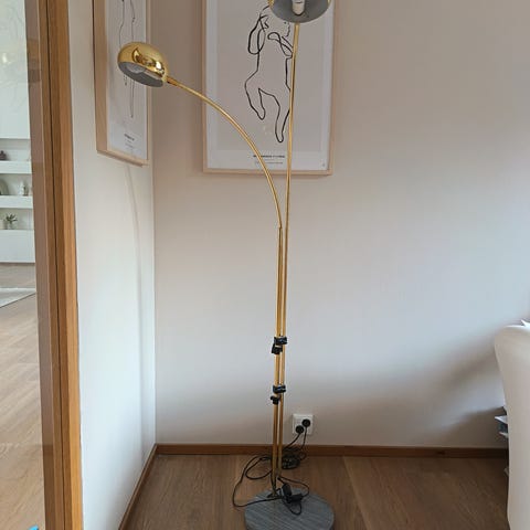 Myydään vintage design- messinginen lattiavalaisin lasitasolla ja marmori jalustalla.
