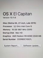 Apple iMac Retina 5K 27-tuumainen työasema, malli Late 2015. Varustettu 3,2 GHz Intel Core i5 -prosessorilla, 16 GB RAM-muistilla. Tallennustilana 1 TB SATA-levy ja 14 GB Flash Storage. Käyttöjärjestelmänä OS X El Capitan versio 10.11.6.