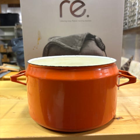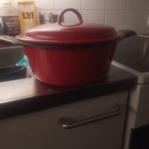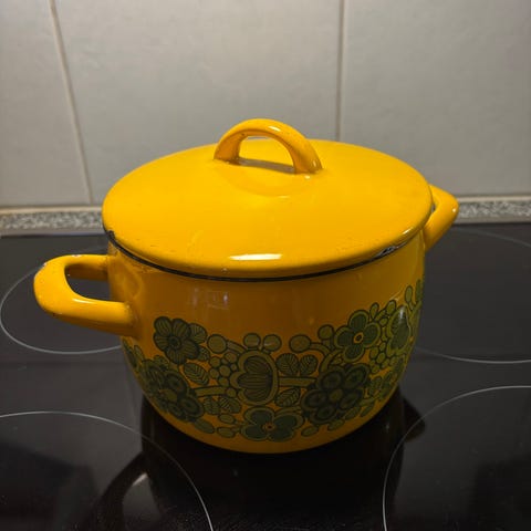 Keltainen kattila on ilmeisesti Kockums. Kannet / pannunaluset / tarjoiluastia, niistä ei ole tietoa kenen valmistamia. Kattilan vetoisuus on 4 litraa, korkeus 14 cm ja halkaisija 22 cm. Isomman kannen leveys 31 ja halkaisija 24 cm ( keskiosan halkaisija 21,5 cm ) ja pienemmän leveys 25 cm ja halkaisija 18 cm ( keskiosan halkaisija 15,5 cm ). Kaikissa käytönjälkiä. Näkyvät kuvissa.