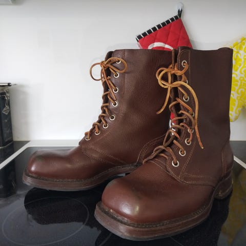 Upeat erittäin hyvässä kunnossa oleva maihinnousukengät . Ei hajuja, valmiina käyttöön! Pohjassa lukee vuosiluku 1955 ja koko 40. Käytännössä koko on lähempänä 43. Nouto tai lähetys.